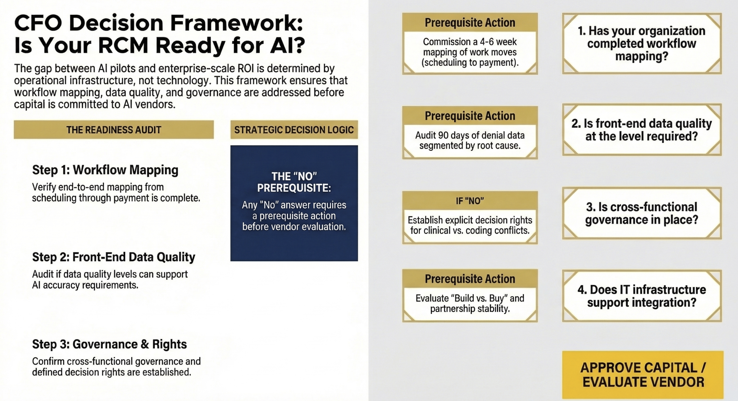 CFO AI-in-RCM decision framework with four sequential questions. (1) Has your organization completed workflow mapping from scheduling through payment? (2) Is front-end data quality at the level required to support AI accuracy? (3) Is cross-functional governance in place with defined decision rights? (4) Does your IT infrastructure support integration requirements? Each "No" answer leads to a prerequisite action before proceeding to vendor evaluation.