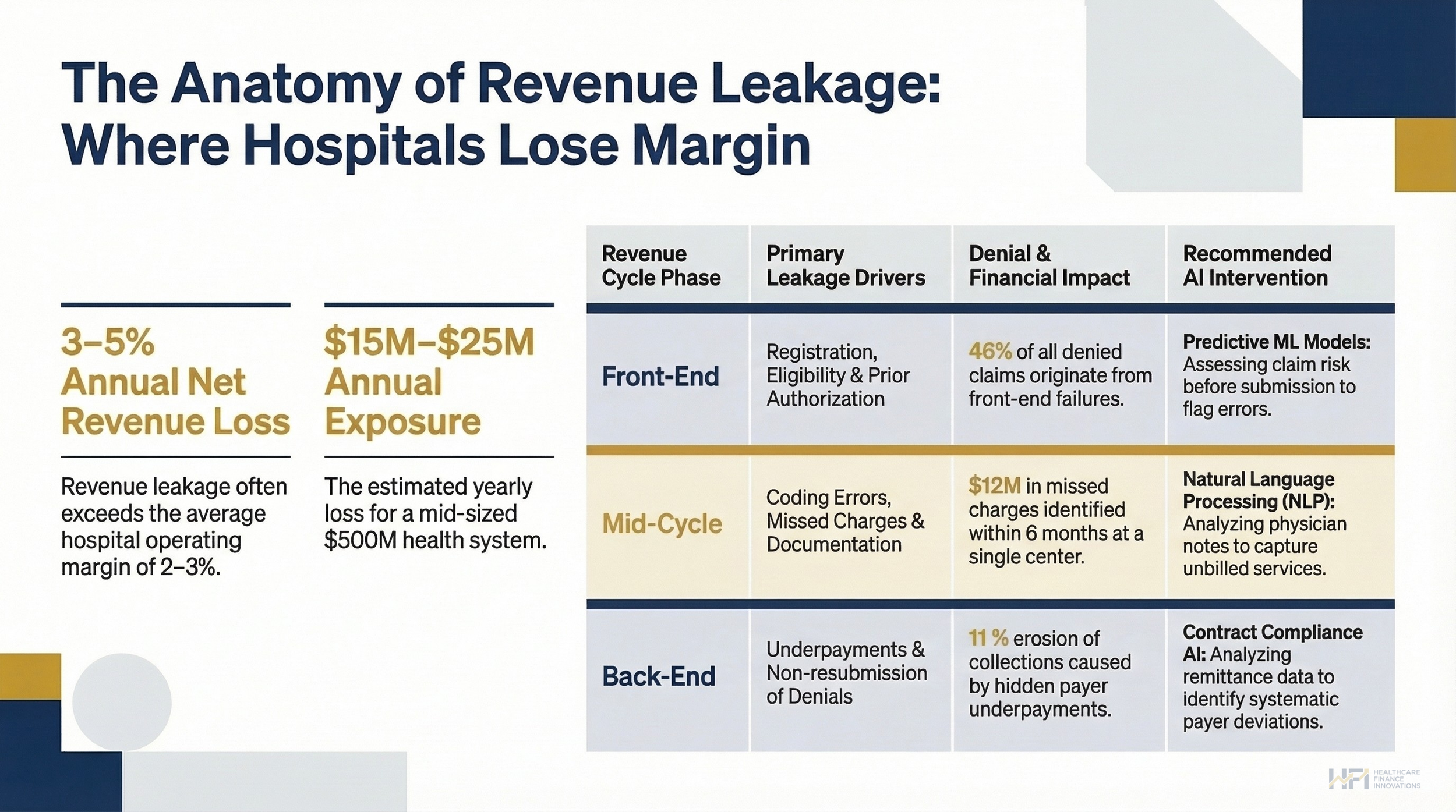 Before evaluating any AI solution, you need a baseline. Revenue leakage is the unintentional loss of income through inefficiencies, missed billing opportunities, and underpayments. Nationally, hospitals lose approximately 3-5% of net revenue annually to these causes. For a $500M health system, that is $15-25M walking out the door each year without a single patient complaint or audit trigger.