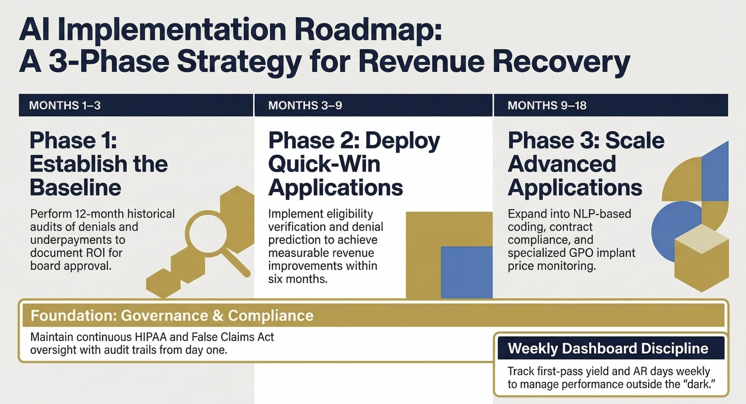 Deploying AI across the revenue cycle requires a deliberate sequence. Systems that try to implement everything simultaneously typically produce neither fast wins nor sustainable infrastructure.